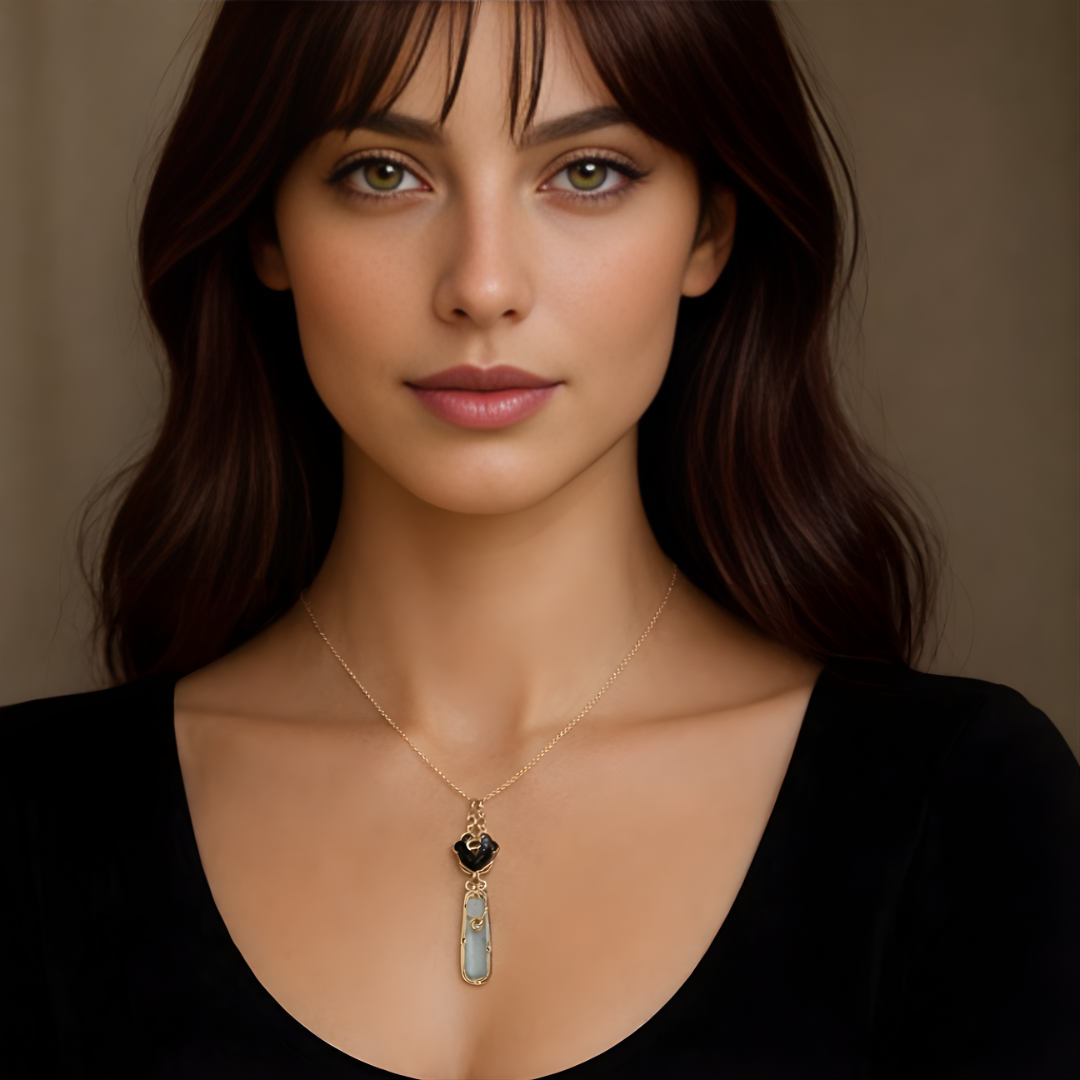 Materials: Hematite Cabochon, Larimar Cabochon, Silver Wire, Gold-filled Wire. The Hematite wire wrap is approximately 1.25" x 1" x 0.5" The Larimar wire wrap pendant is approximately 1.75" x 0.5" x 0.5"  The chain is approximately 18.5" long.