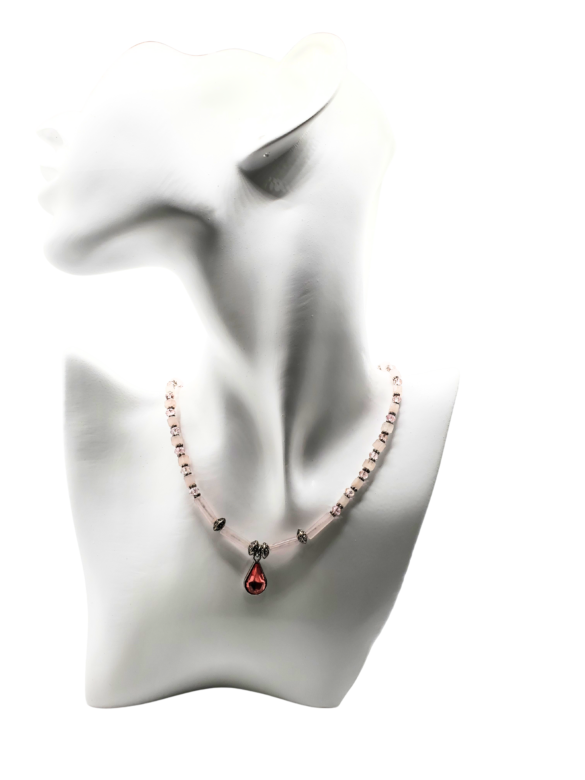 Materials: Rose Quartz, wire, eye-hook clasp, silver-plated spacer beads, pink crystal pendant, crimp beads, jump rings. Approx. 18.25 inches long.