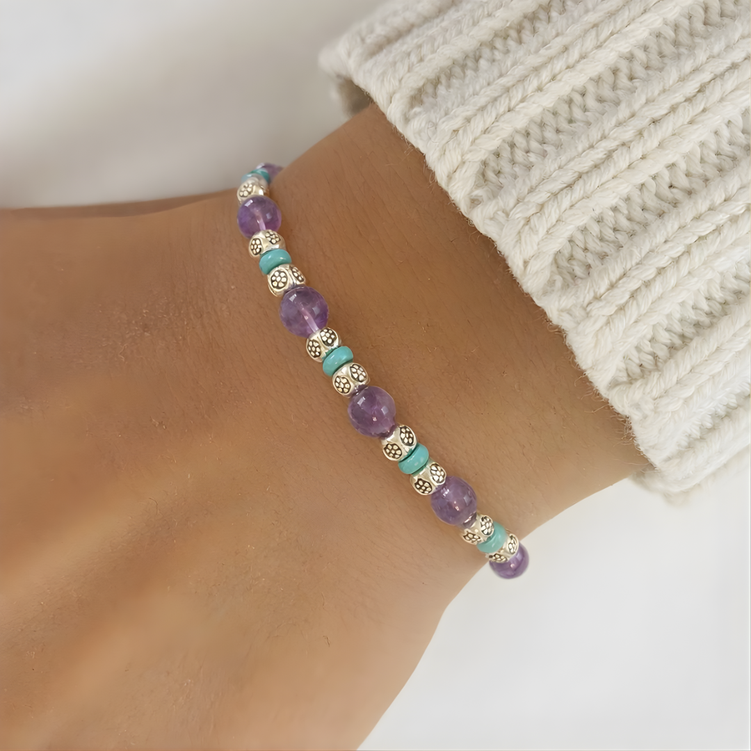 You wouldn't think that this dainty Turquoise Howlite Amethyst Bracelet carries all this energy. However, it is loaded with creativity.